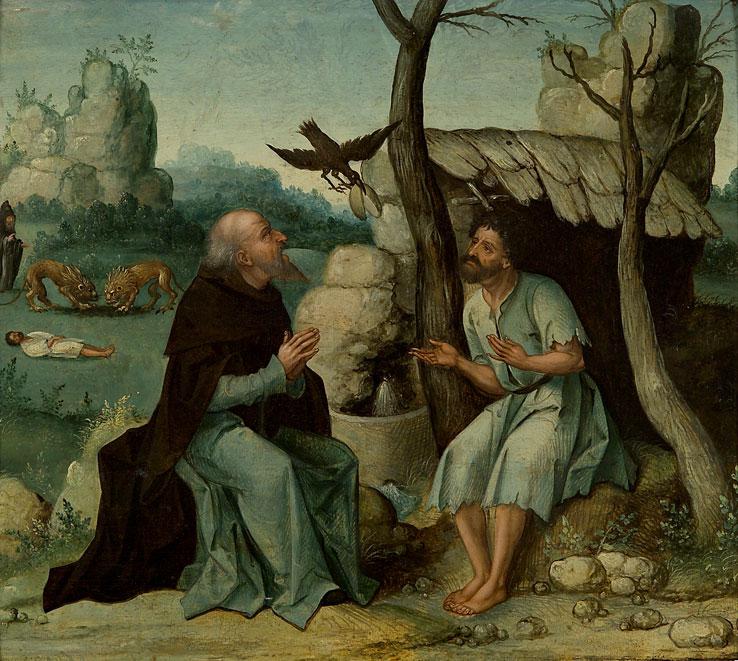 Saint Antoine Abbé, guérisseur des maladies infectieuses, notamment des maladies de peau, était souvent représenté au Moyen-Âge et à la Renaissance. Plus souvent la tentation de saint Antoine, avec diables et prostituées, que la rencontre de saint Antoine et saint Paul Ermite, plus austère… D’après la Vie de saint Paul Ermite écrite au quatrième siècle par saint Jérôme et reprise dans la Légende dorée, Saint Antoine lui rend visite dans le désert égyptien (ici résumé à un paysage sans habitation). Ils s’assoient au bord d’une source. Un corbeau leur apporte un pain. Saint Paul explique que d’ordinaire le corbeau n’apporte qu’une moitié de pain... Plus tard, saint Antoine revient enterrer saint Paul. Deux lions creusent la tombe. Les deux scènes sont ici représentées sur deux plans différents, la différence dans l’espace se substituant à la différence dans le temps.